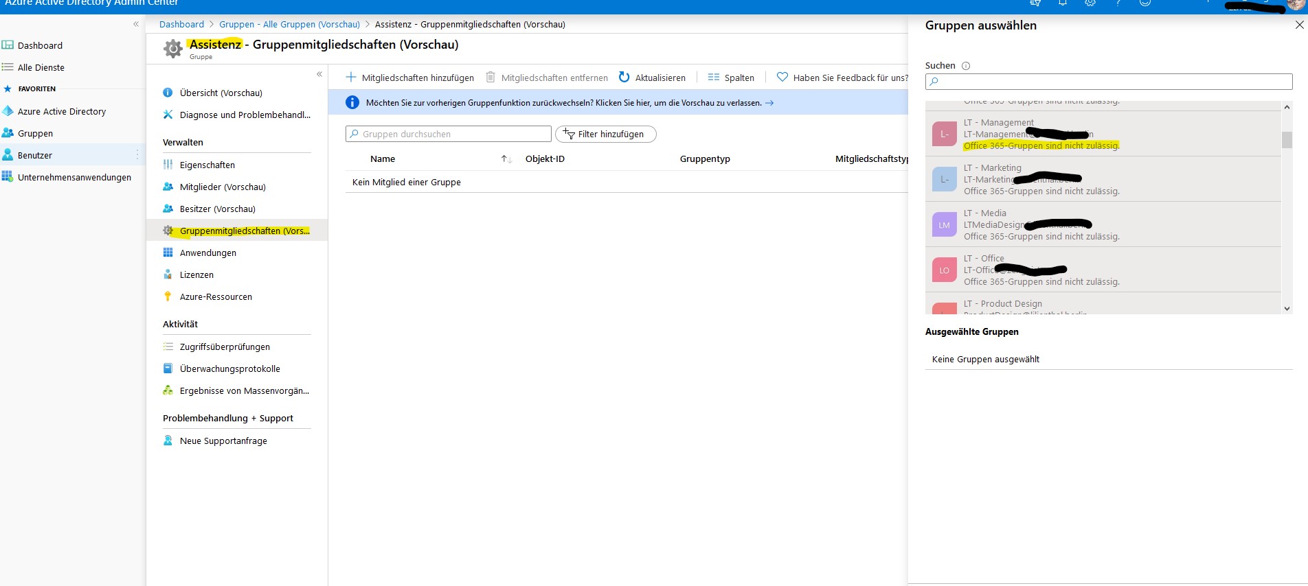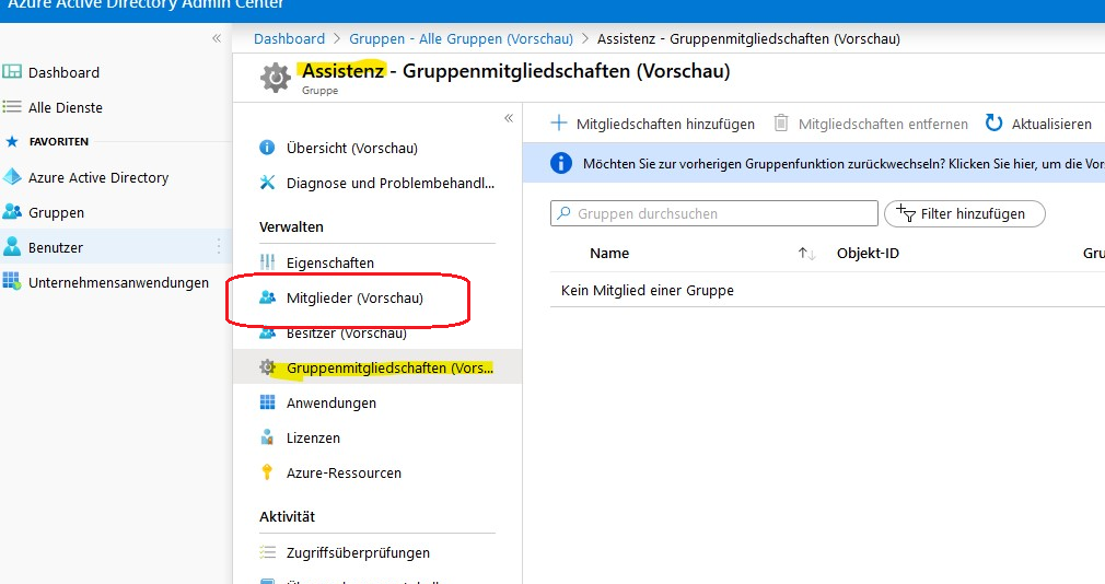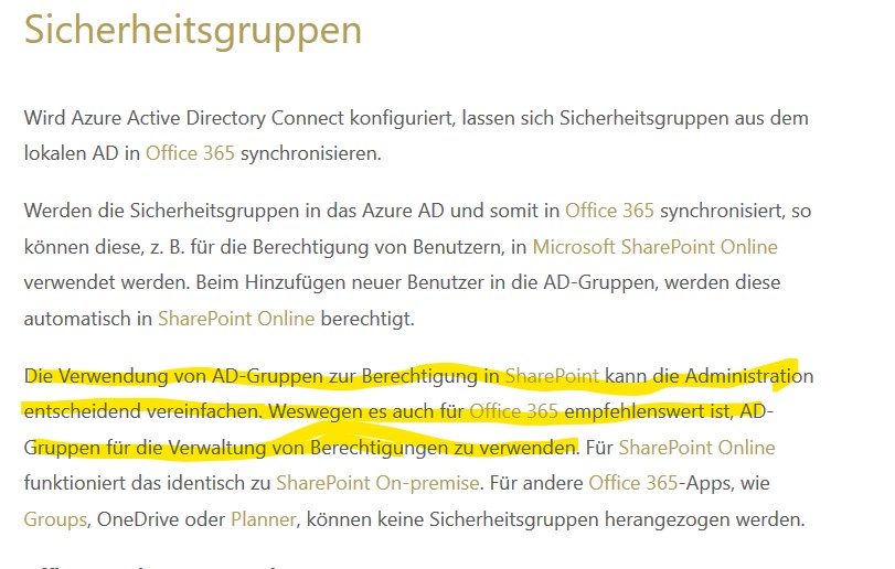 Aber ich kann diese nicht der Gruppe zuweisen, die ich gerne hätte. Auch umgekehrt geht es leider nicht, also die Office365 Gruppe der AD Gruppe zuweisen.