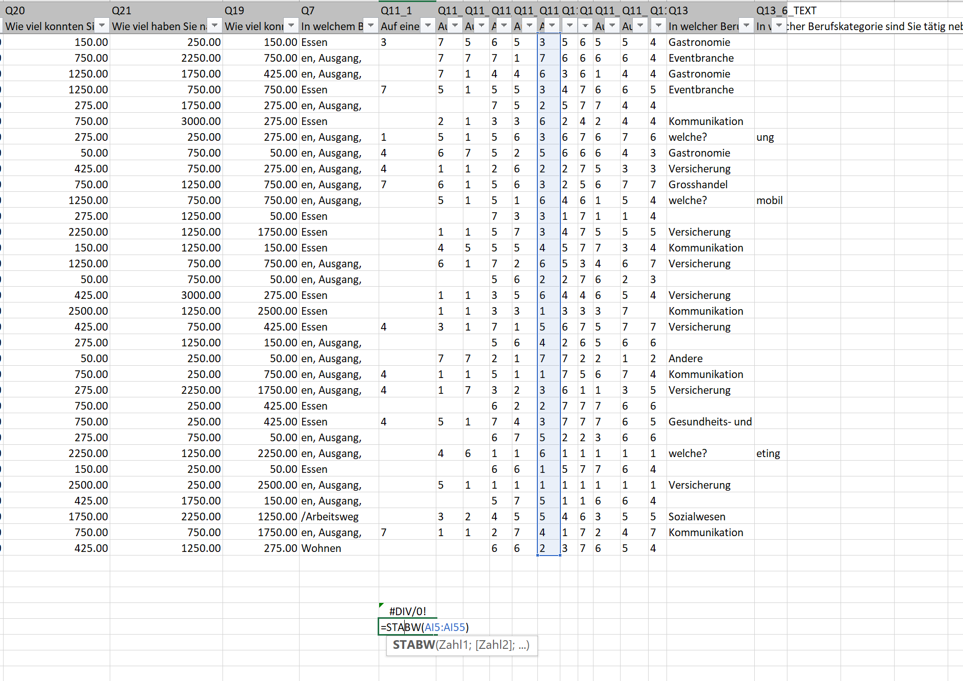 Leider kann ich beim Auswerten einer Umfrage keine Korrelation berechnen. Bei der Formeleingabe gibt es immer einen Division durch Null Fehler (#DIV/0!). Ich habe die Zellen überprüft und keine ist leer, bzw hat eine 0. Weshalb kommt diese Fehlermeldung? Ich muss zwingend die Korrelation berechnen, weshalb mir die Wennfehler Funktion auch nicht weiterhilft.