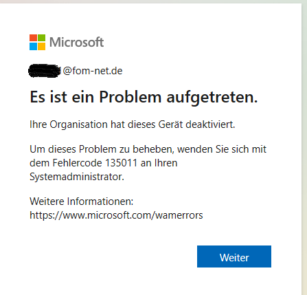 Bitte gehe im Admin Center / Azure AD Admin Center / Azure Active directory / Devices und prüf, ob das Gerät deaktiviert ist.
