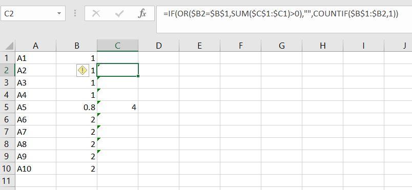 =IF(OR($B 2=$B,Summe($C-1:$C 1)>0),"",COUNTIF($B$1:$B 2,1))