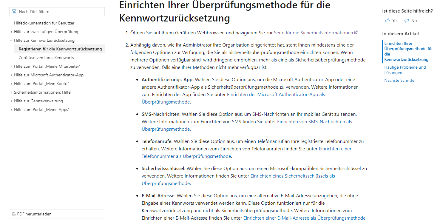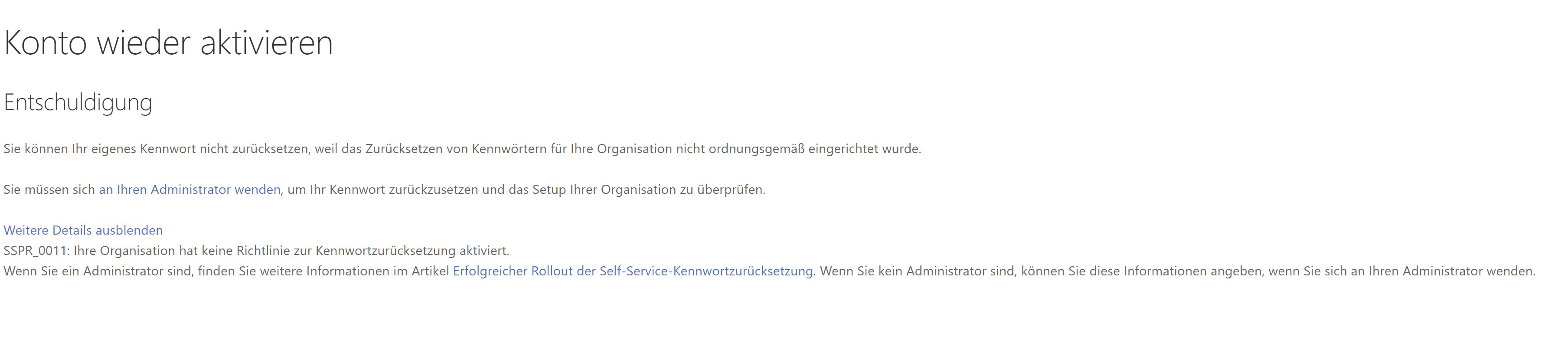 Vielen Dank für Ihre Informationen. Die Fehlermeldung zeigt, dass dieser Benutzer die SSPR-Methode nicht registriert hat. Sie können ihn auf diese Seite zur Registrierung zugreifen lassen: Sicherheitsinfoseite . Bitte lassen Sie den Benutzer bei der Registrierung diesem Artikel folgen:Richten Sie Ihre Methode zum Zurücksetzen des Passworts ein: Möglicherweise müssen Sie sich an die IT-Abteilung der Partei wenden, die Ihnen Ihr Konto mit diesem Problem zur Verfügung gestellt hat, um weitere Informationen zu den Richtlinien des Instituts zu erhalten, da für diese Art von Konto spezielle Richtlinien gelten, die von kontrolliert werden die Informatikabteilung der Institution, die Ihnen dieses Konto gewährt hat.