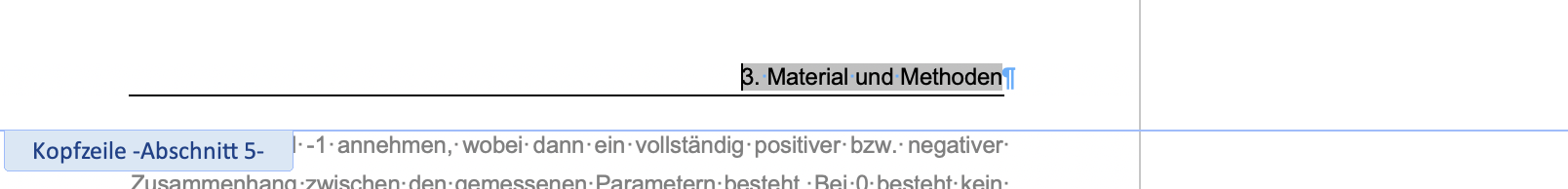 ich habe ein Problem bei meiner Doktorarbeit bezüglich des Abstandes zwischen Text und Kopfzeile. Hierzu zwei Bilder, auf dem ersten sieht man die Kopfzeile in einem Kapitel. Der Abstand zwischen Kopfzeile und Text ist so gewünscht und wird durch die blaue Linie von Word so angegeben. Beim nächsten Kapitel (inklusive Zeilenumbruch) befindet sich er Text direkt an der Kopfzeile, was man auch durch die blaue Markierungslinie sehen kann. Durch eine Veränderung der Breite der Kopfzeile, verrutscht nur die gesamte Kopfzeile, auch die blaue Linie. Ich möchte aber, dass die blaue Linie den Abstand hat, wie auf dem ersten Bild (Kapitel Material und Methoden). Könnt ihr mir da helfen? Ich bin schon seit Tagen am Verzweifeln.