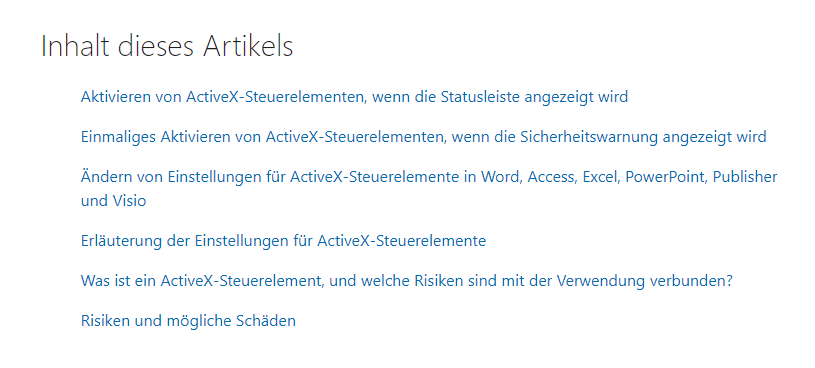 Um Ihr Problem zu lösen, empfehlen wir Ihnen, die Anweisungen des folgenden Artikels zu lesen: Aktivieren oder Deaktivieren von ActiveX-Einstellungen in Office-Dateien (microsoft.com)