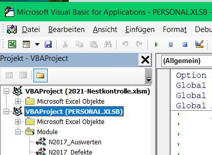 Es hapert noch mit der Reihenfolge. Jetzt ist die Aktive Arbeitsmappe der führende Projektordner, PERSONAL.XLSB ist untergeordnet und ich muss die Datei jedesmal aufrufen / einbinden. In den Optionen habe ich keinen Eintrag gefunden. Auch wenn zuerst PERSONAL.XLSB aufrufe und nachher Entwicklertools => Visual Editor, ist die Arbeitsmappe führend.