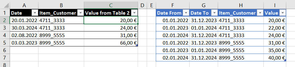 C2: =SUMMEWENNS(Table2[Value];Table2[Item_Customer];[@[Item_Customer]];Table2[Date From];"<="&[@Date];Table2[Date To];">="&[@Date])