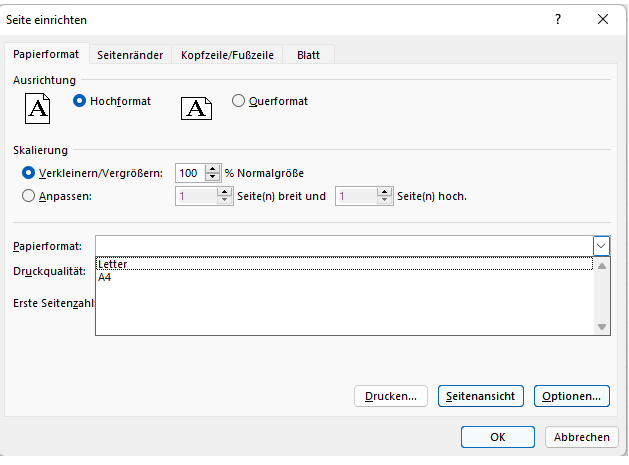 Die in den Office-Anwendungen verfügbaren Papierformate werden vom Gerätetreiber auf Ihrem Drucker bereitgestellt, das Update auf Windows 11 hat diesen Treiber möglicherweise beschädigt.