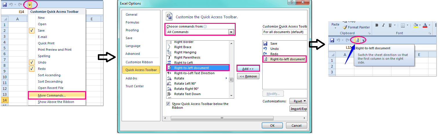 - Nachdem Sie die Dokumentoption von rechts nach links hinzugefügt haben, klicken Sie auf OK, um dieses Dialogfeld zu schließen. Jetzt sehen Sie, dass in der Symbolleiste für den Schnellzugriff anpassen eine Dokumentschaltfläche von rechts nach links angezeigt wird.