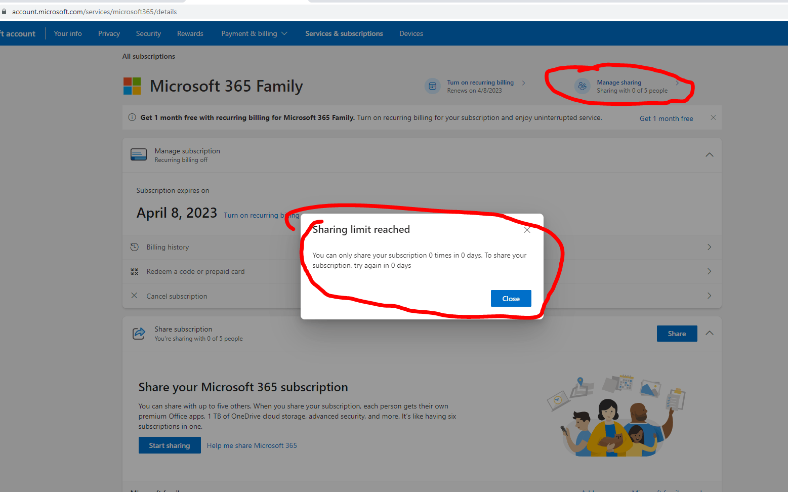 You can only share your subscription 0 times in 0 days. To share your subscription, try again in 0 days"