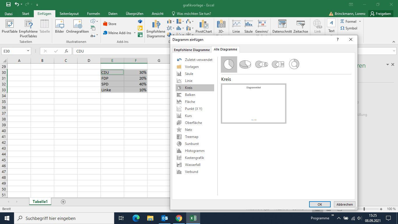 Excel erwartet Überschriften über den Daten, schreib mal Partei in E29 und Anteil in F29 und dann probier es nochmal.