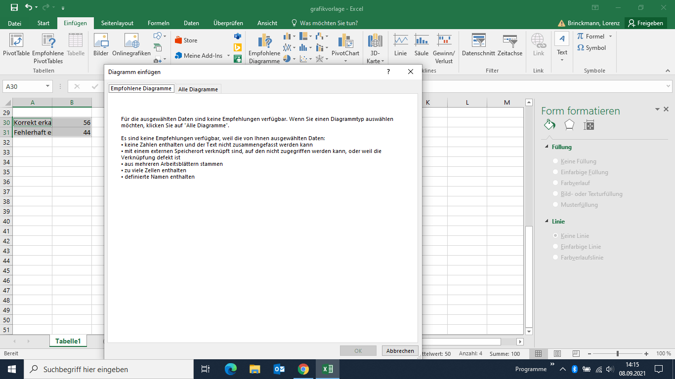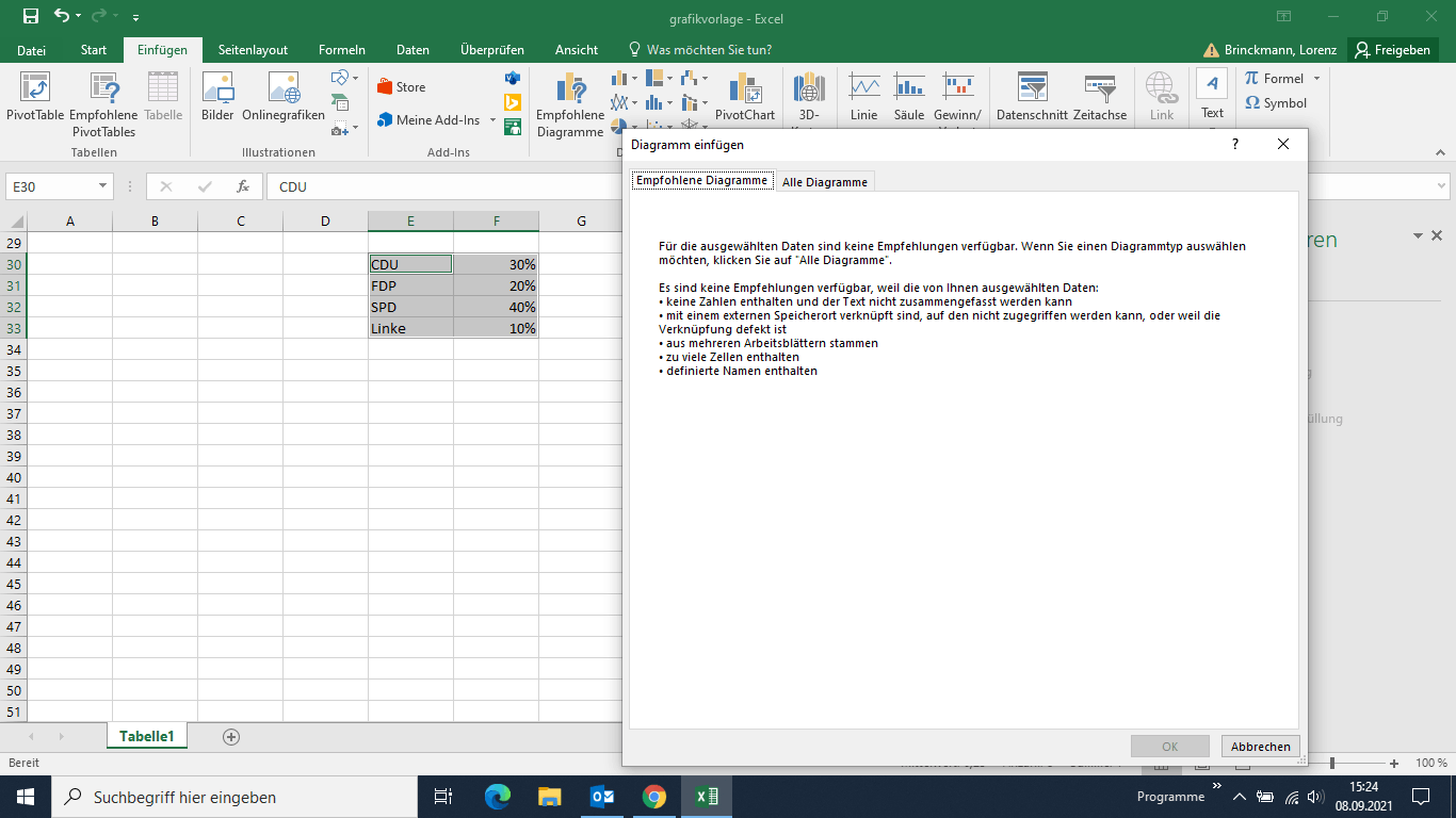Leider macht Excel mir selbst bei einfachsten Datensätzen keine Diagrammvorschläge, und die auszuwählenden Diagramme sind komplett durcheinander. Woran kann das liegen? Habe mal einen Screenshot beigefügt.