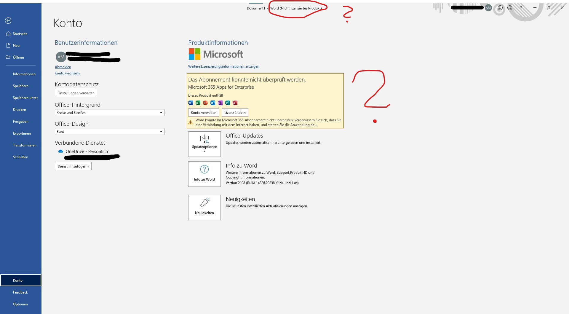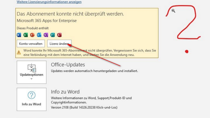 Wenn Sie in Word in diesem Fenster Datei - Konto auf die Schaltfläche "Lizenz ändern" klicken, finden Sie dann Ihre korrekte Lizenz und ändern Sie die installierte Version in die richtige Lizenz?