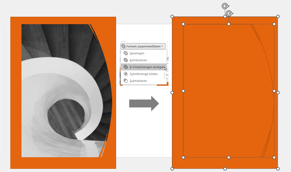 - Klicke Form und Bild mit gedrückter Strg-Taste an, um beide zu markieren. Auf dem Register Bildformat wähle Formen zusammenführen - In Einzelmengen zerlegen. Du hast nun in der Mitte eine Freihandform, die dieselbe Form wie das Bild hat. Den Rest des Rechtecks, das wie ein Rahmen drumherum liegt, kannst Du löschen.