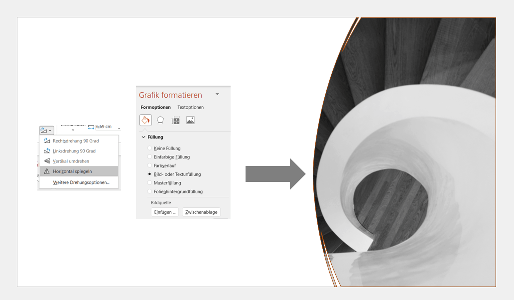 - Spiegele die Form und passe ggf. ihre Größe an. Mit einem Rechtsklick rufst Du Form formatieren auf und wählst dort Bild- oder Texturfüllung. Über die Bildquelle wählst Du das ursprüngliche Bild aus.