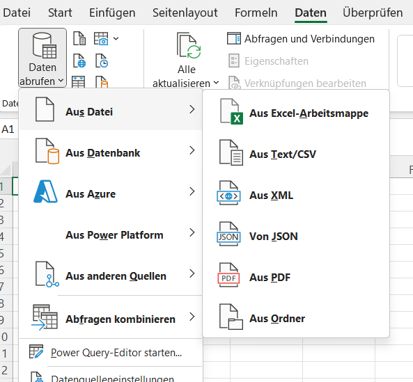Entschuldigung für die fehlende Datei in der Menüleiste, aber Sie können die Funktionen Daten abrufen zum Menüband der Registerkarte Daten hinzufügen. Bitte gehen Sie dazu vor: