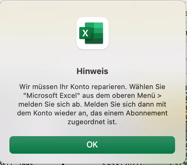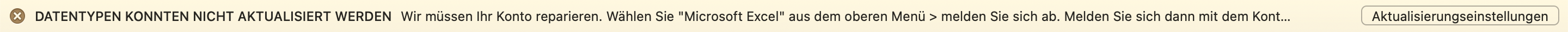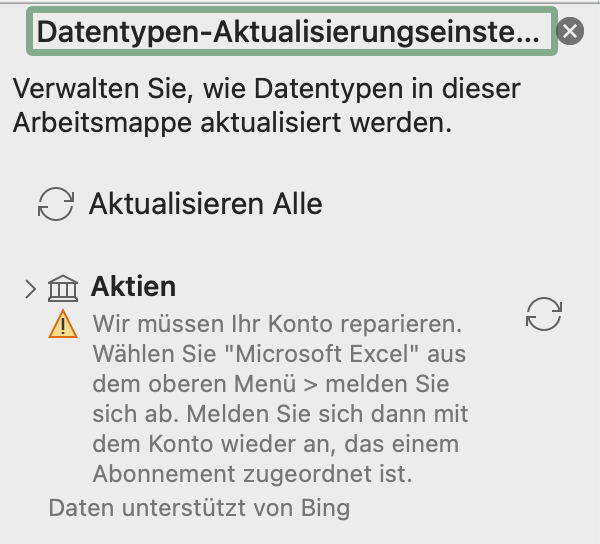 Fehler an meinem Konto ausgeschlossen. Entfernt man die Anmeldung und Lizenz, dann funktioniert die Aktualisierung der Aktienkurse nach der erstmaligen Anmeldung und Lizenzierung von Office wieder. Das Problem tritt allerdings beim Schließen und nochmaligen Öffnen von Office wieder auf, nachdem oben dargestellter Dialog "Microsoft respektiert Ihre Privatsphäre" erschienen ist. Dann funktioniert zwar das Office-Paket grundsätzlich weiterhin (Lizenz und Anmeldung), aber die Lizenz- und Anmeldedaten scheinen bei der Aktualisierung der Aktienkurse nicht weitergereicht zu werden. Oben dargestellte Fehlermeldungen erscheinen wieder. Mit sehr hoher Wahrscheinlichkeit liegt ein Fehler im Office für Mac vor, der nur von Microsoft behoben werden kann.