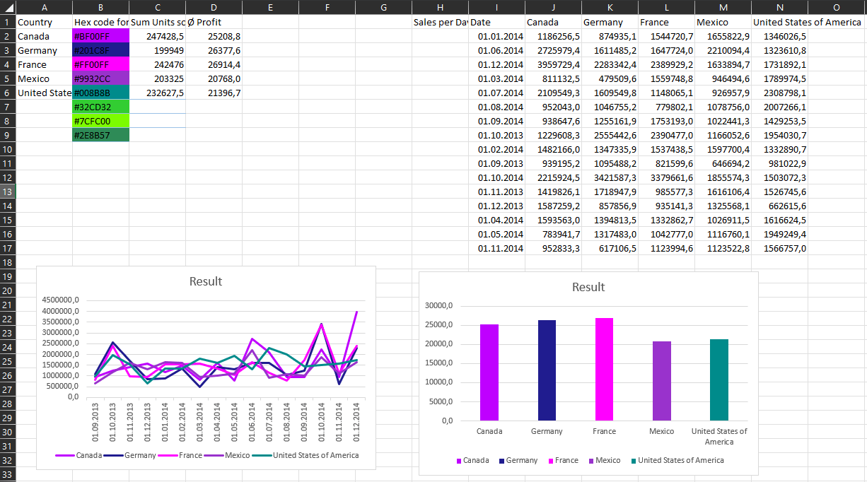 Ich würde gern die Diagramme "Result" automatisch entsprechend der vorgegebenen Farbe einfärben. Die Diagramme sollen dabei aber vollständig auf den arrays basieren und sich vollkommen dynamisch anpassen.