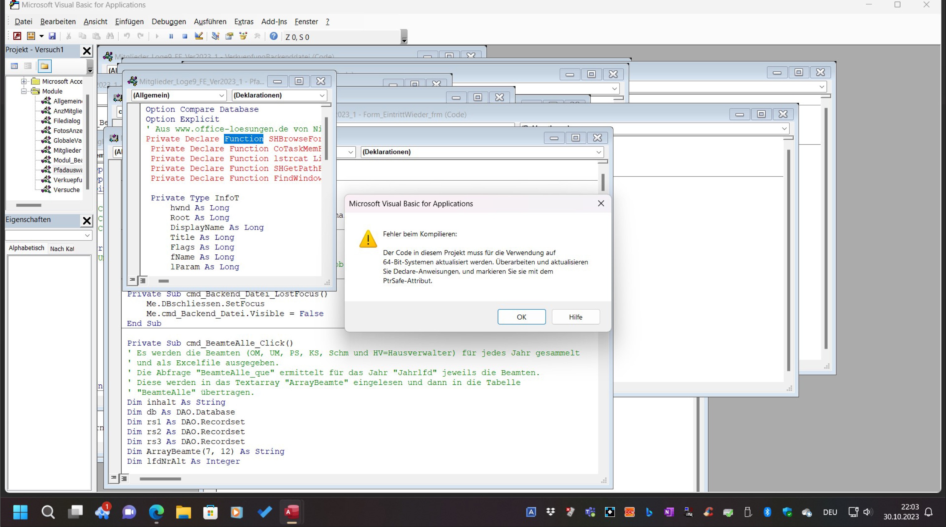 Wenn man sehr viele API-Funktionen hat oder sich mit diesen Anpassungen nicht auskennt bzw. nicht erfolgreich ist, kann es einfacher sein, das 64 Bit-Office zu deinstallieren und 32 Bit zu installieren. Oder du lässt dir den Code von jemandem anpassen, der sich auskennt. Ich habe gerade eine Access-Entwickler-Konferenz in Nürnberg durchgeführt mit 110 Access-Profis. Es gibt sie also noch. Und nein, ich habe mehr als genug zu tun. ;-)