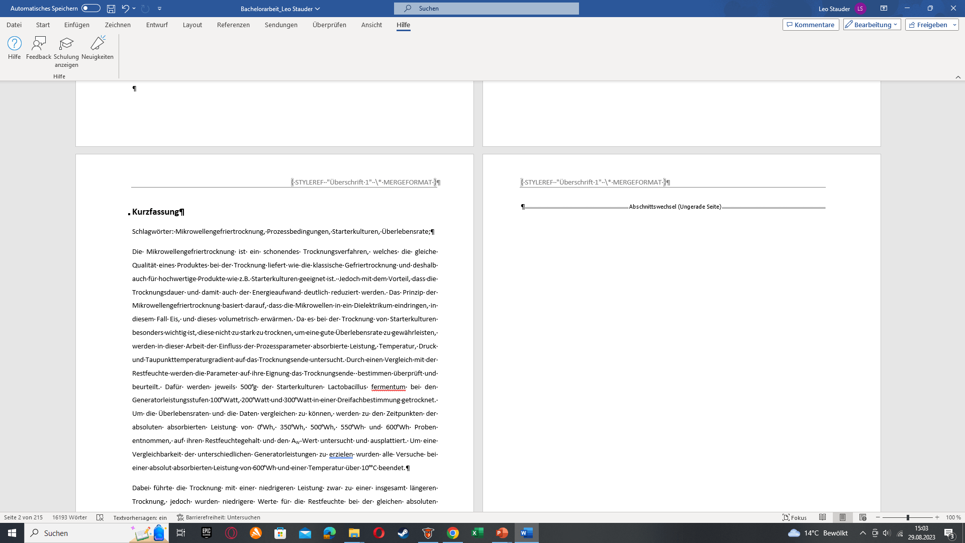 Es tut mir leid, dass Sie Probleme mit dem StyleRef-Feld in Ihren Kopfzeilen haben. Eine mögliche Lösung für Ihr Problem könnte darin bestehen, dem Feld StyleRef den Schalter /l hinzuzufügen, wodurch StyleRef gezwungen wird, vom unteren Rand der Seite nach oben zu suchen. Dies kann das Problem mit Überschriften beheben, die auf leeren Seiten und auf einigen gefüllten Seiten nicht angezeigt werden. Wenn dies nicht funktioniert, können Sie versuchen, auf den Seiten, auf denen der Überschriftentext nicht angezeigt wird, nach leeren Formatvorlagen für Überschrift 1 oder Abschnittsumbrüchen zu suchen, da diese die Verweise beschädigen könnten. Ich hoffe das hilft! Lass es mich wissen, wenn du weitere Fragen hast. Viel Erfolg bei Ihrer Abschlussarbeit!