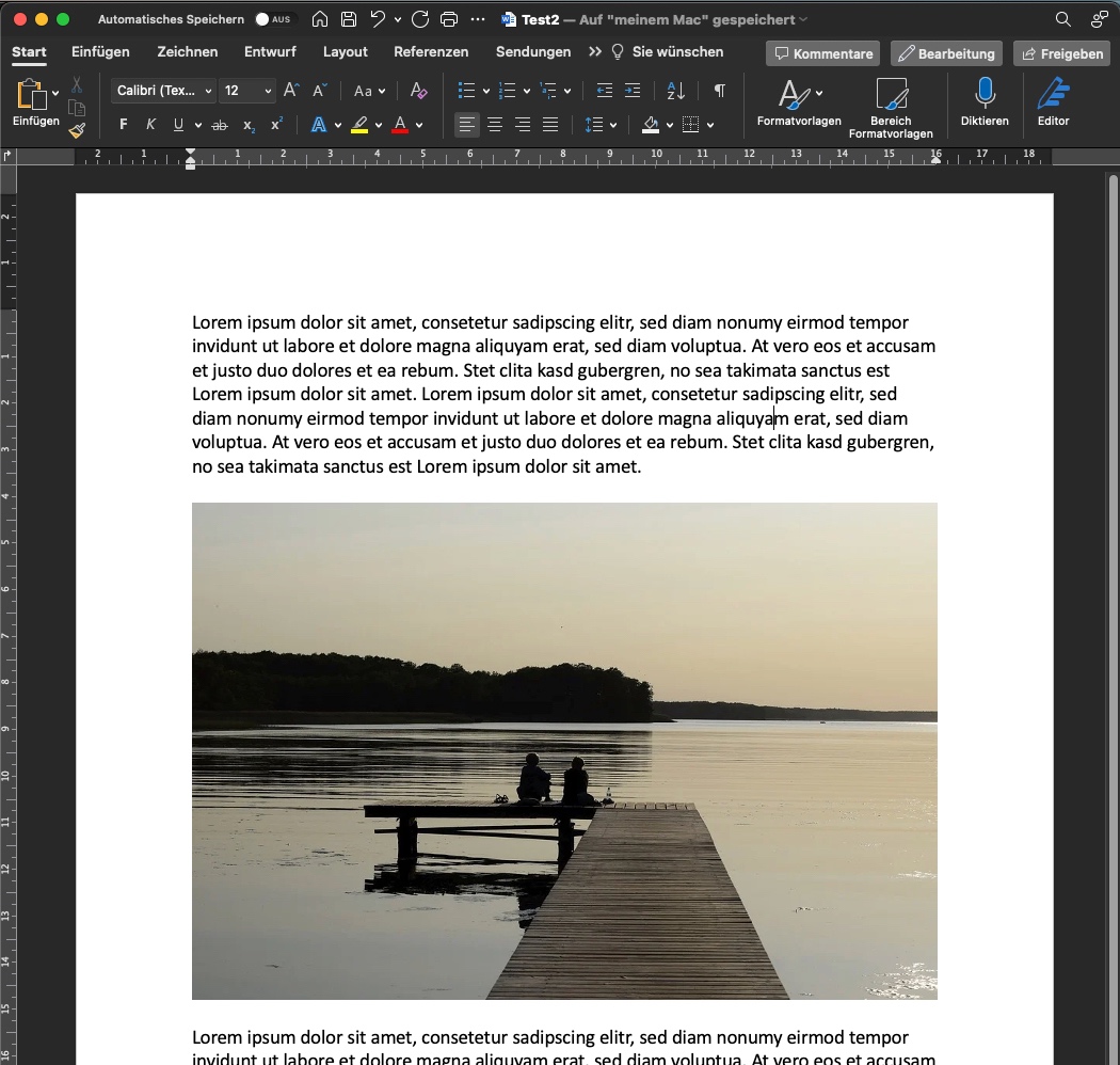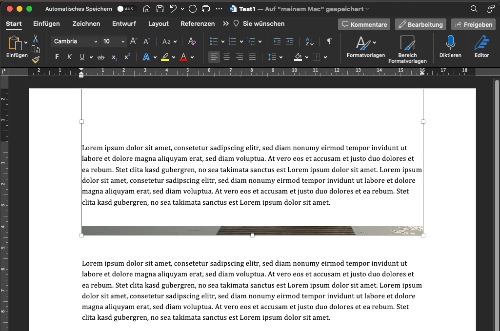 Ich habe ein Dokument, in dem Bilder immer am oberen Seitenrand hinter dem Text eingefügt werden. Ich habe einen Absatz dieses Dokumentes in ein neues Dokument kopiert und zwei Absätze mit Lorem ipsum erstellt. Das Problem wurde durch Kopieren des Textes in das neue Dokument übertragen.