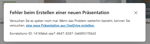 Stelle bitte sicher, dass du eine Lizenz für die lokale Office Anwendungen bekommen hast. Gehe dafür zu dem Abonnementslink. Damit man die lokale Office Anwendungen nutzen kann, soll dort "Die neueste Desktopversion von Office" gelistet sein. Ohne das kann man nur Office im Browser und auf mobilen Geräte, welche keine Aktiverung verlangen, nutzen. Passirt dasselbe, wenn du eine neue Präsentation im PowerPoint Online erstellst? Teste bitte noch eine neue Präsentation direkt im OneDrive oder SharePoint zu erstellen.