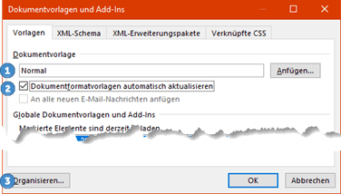 - Die Option "Dokumentformatvorlagen automatisch aktualisieren" anklicken. Dann werden alle Formatvorlagen des aktuellen Dokuments mit denen der Normal.dotm überschrieben.