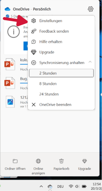 Ich habe bemerkt, dass Sie erwähnt haben, dass OneDrive es Ihnen nicht erlaubt, die Auswahl von Ordnern aufzuheben, dies liegt daran, dass Ihr Gerät bestimmte Dateien automatisch synchronisiert, Sie können die temporäre OneDrive-Synchronisierung deaktivieren, bevor Sie die Auswahl bestimmter Ordner aufheben. Um die OneDrive-Synchronisierung vorübergehend zu deaktivieren, klicken Sie auf das OneDrive-Symbol in der Taskleiste in der unteren rechten Ecke Ihres Desktops > klicken Sie auf Einstellungen in der oberen rechten Ecke der Popup-Oberfläche > klicken Sie auf Synchronisierung anhalten.