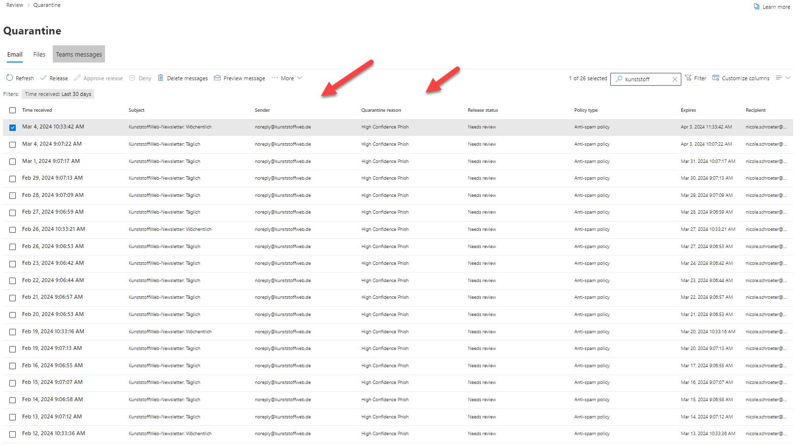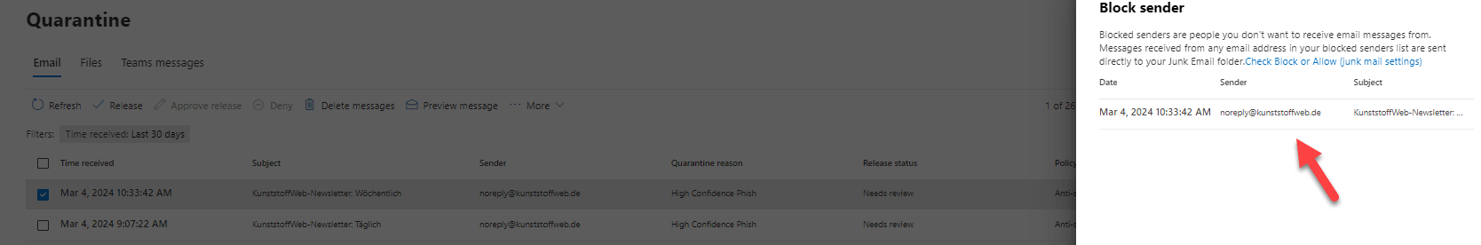 Aber basierend auf Ihrer Beschreibung und meiner Suche habe ich festgestellt, dass die Microsoft Defender-Blockierung von E-Mails tatsächlich ein Feature ist, das in Microsoft 365-Organisationen verfügbar ist, die über Postfächer in Exchange Online oder in eigenständigen Exchange Online Protection (EOP)-Organisationen mit Postfächern in Exchange Online verfügen, und kein Feature ist, das einzelnen Benutzern zur Verfügung steht. Im folgenden Artikel wird diese Funktion ausführlicher beschrieben, und Sie können darauf zurückgreifen.
