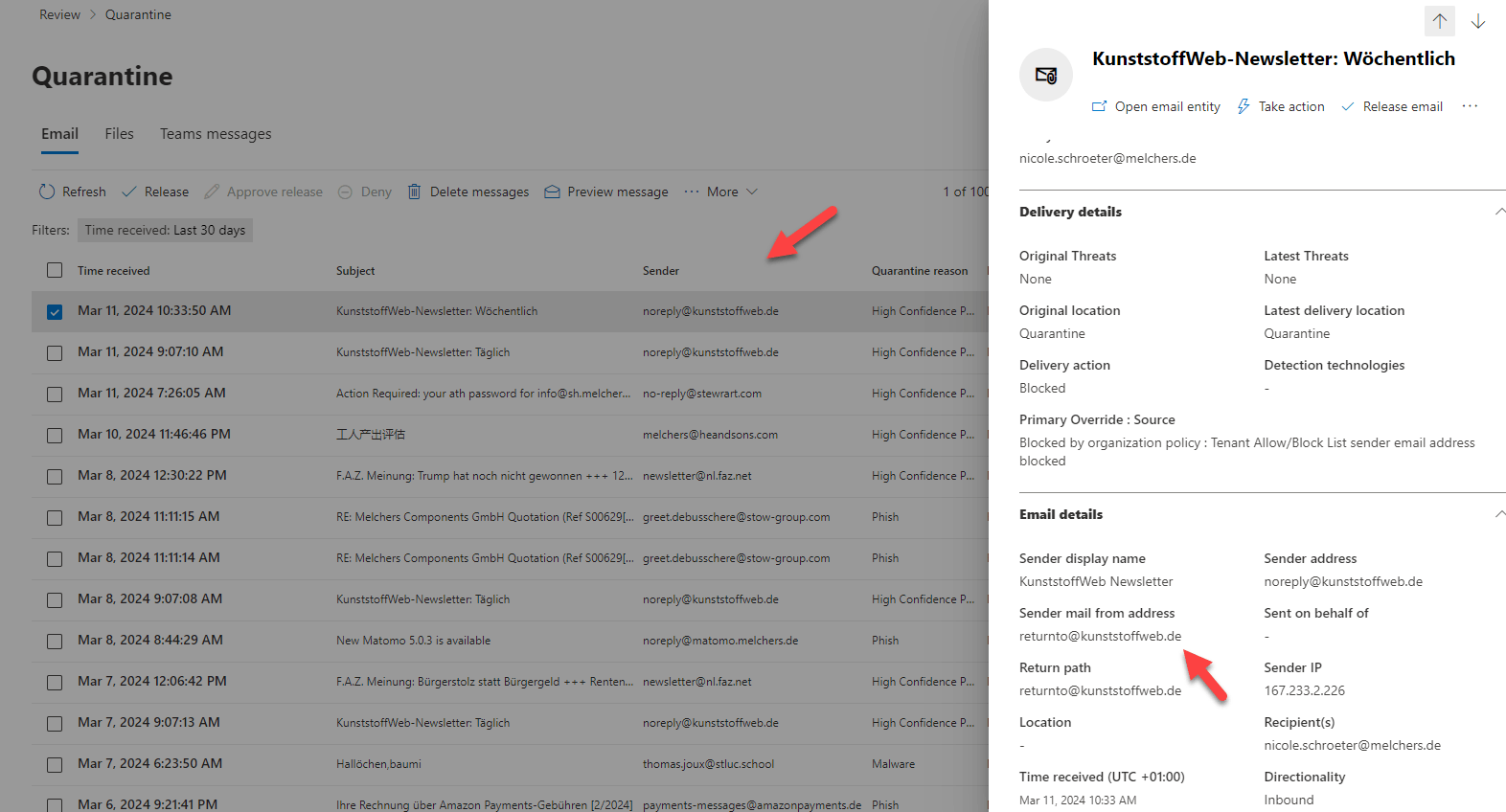 Zulassen oder Blockieren von E-Mails mithilfe der Mandanten-Zulassungs-/Sperrliste | Microsoft Learn