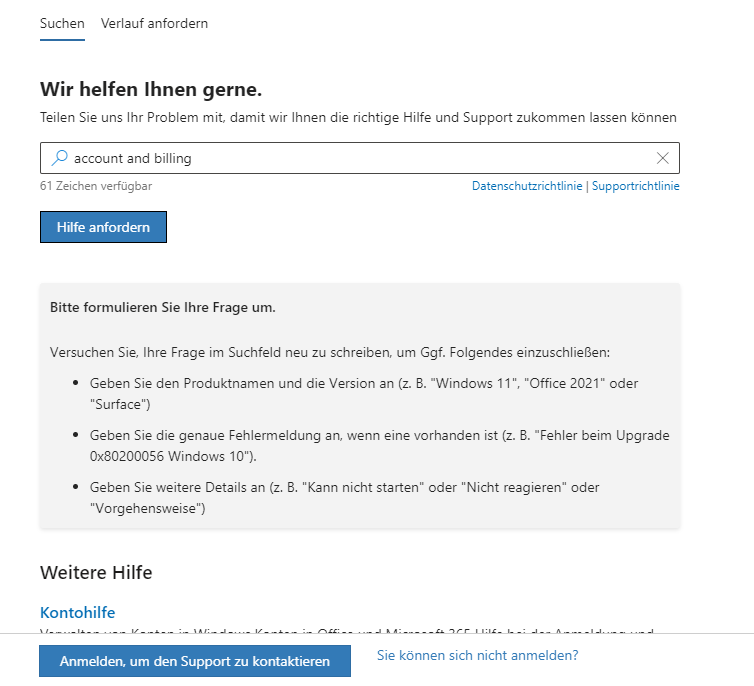 2.Geben Sie "Konto und Abrechnung" ein, drücken Sie die Eingabetaste und klicken Sie unten auf Support kontaktieren: