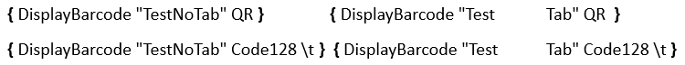 { DisplayBarcode "Test<TAB>Tab" Code128 \t }