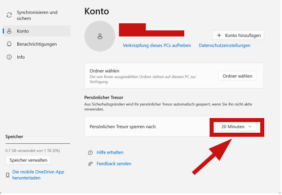 - Im unteren rechten Bereich der Kontoseite sehen Sie ein Dropdown-Feld, um die automatische Sperrzeit von OneDrive Personal Safe anzupassen, Sie können die entsprechende Zeit nach Ihren Bedürfnissen einstellen