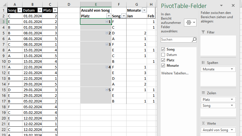 Diese Daten schreibt man stumpf Zeilenweise untereinander und formatiert das als Tabelle. Dann kann man davon eine Pivottabelle erstellen und die Songs zählen.