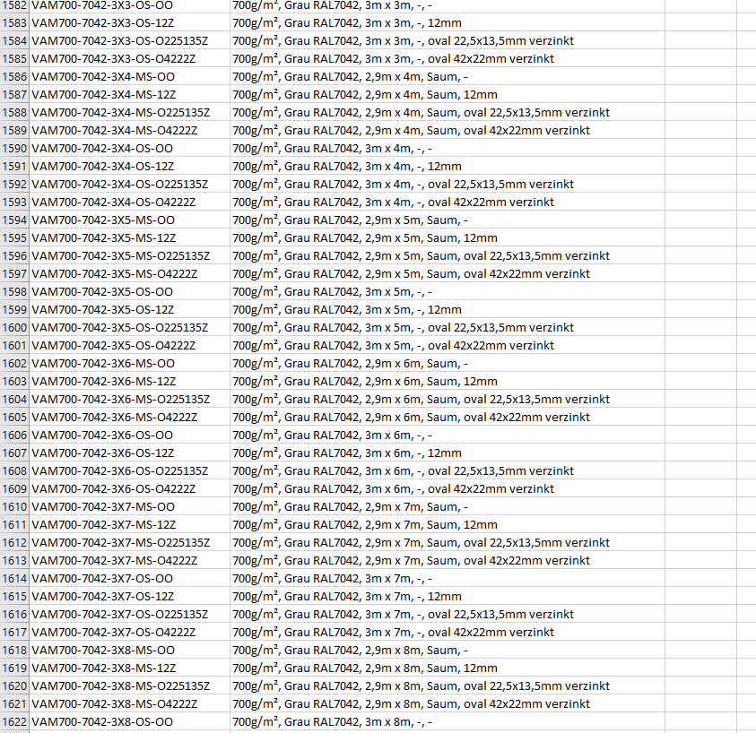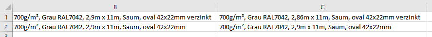 Spalte B1 hat beispielsweise diesen Inhalt: "700g/m², Grau RAL7042, 2,9m x 11m, Saum, oval 42x22mm verzinkt"