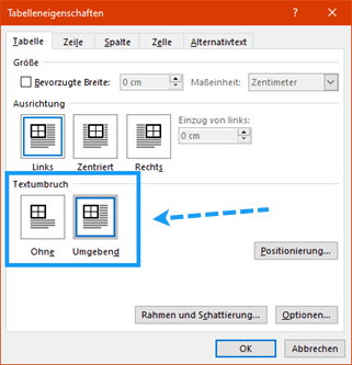 Eine Tabelle ist mit einem Textumbruch "Umgebend" positioniert, wenn in den Tabelleneigenschaften die entsprechende Option aktiviert wurde: