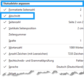 Hier ein BIld mit Formatierungszeichen. Wo schalte ich die Abschnitts-Information in der Statusleiste ein?