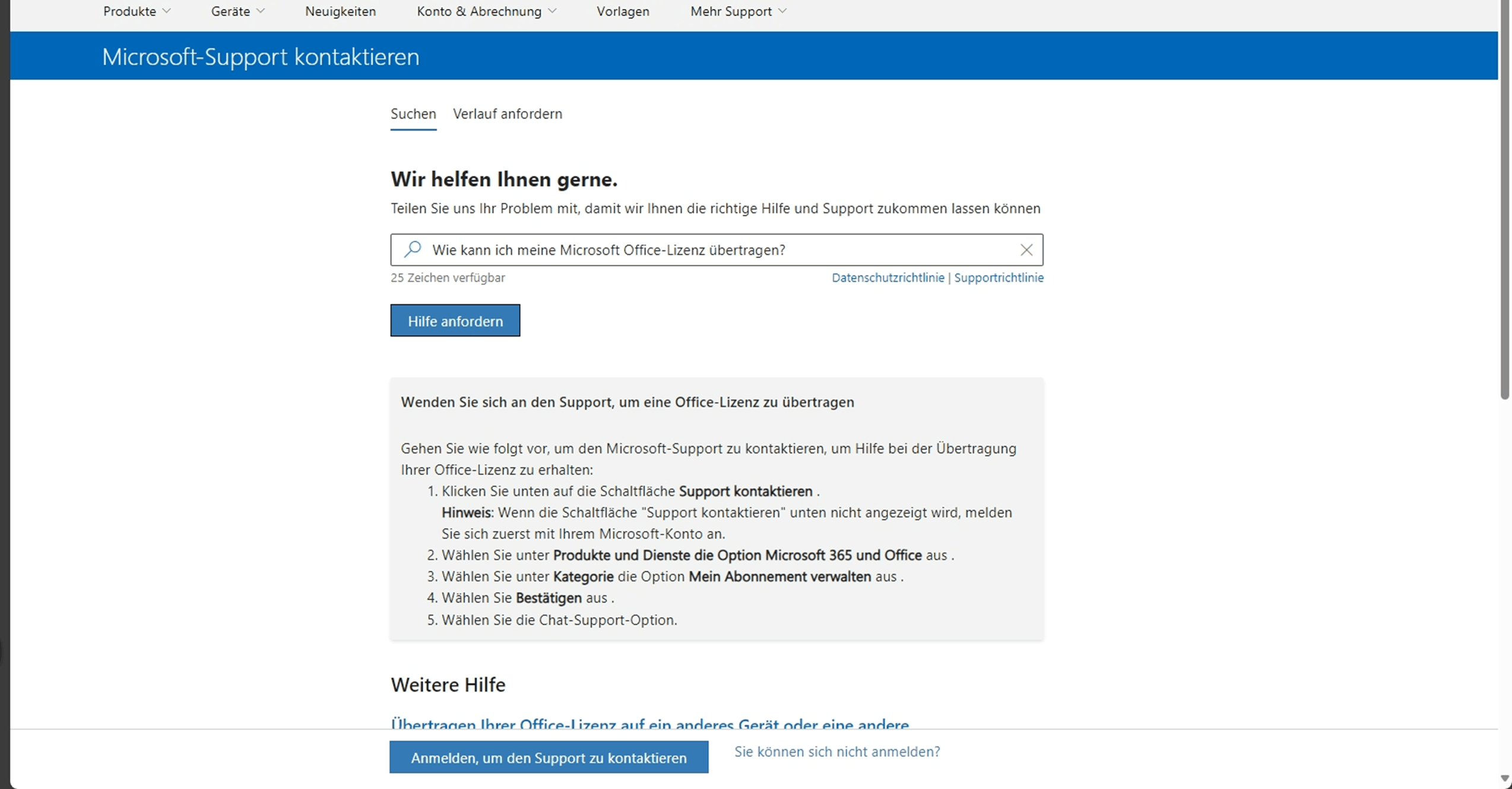 Für Benutzer im Europäischen Wirtschaftsraum (EWR) können Sie Ihre Lizenz auf eine andere Person übertragen, soweit dies nach geltendem Recht zulässig ist, indem Sie sich an Kontakt – Microsoft-Support wenden. Sie müssen Ihre Identität über Ihr Microsoft-Konto bestätigen, um zu bestätigen, dass Sie über legitime Lizenzrechte verfügen. Sie müssen auch eine E-Mail-Adresse für die Person angeben, an die Sie die Lizenz übertragen. Nach der Überprüfung kündigt Microsoft Ihre Berechtigung und sendet dem neuen Lizenznehmer per E-Mail Anweisungen zum Zuordnen der Lizenz zu seinem Microsoft-Konto. (Wenn der neue Lizenznehmer noch kein Microsoft-Konto hat, muss er eines erstellen.)