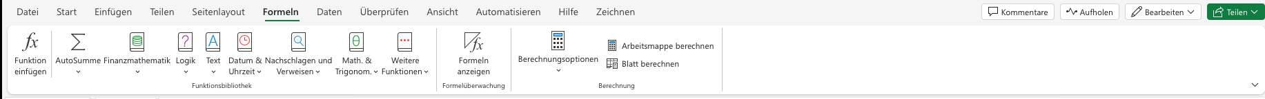 ich verzweifle gerade ein bisschen an der Browserversion von Excel. Ich muss zugeben, dass ich nicht sonderlich versiert im Thema Excel bin, probiere aber mein Problem bestmöglich zu beschreiben. Ich muss für die Uni ein paar Aufgaben in Excel bearbeiten. Ich habe dazu ein Tutorial von der Uni auf Englisch angeguckt, indem die Funktionen von "Defined Names" unter Formeln verwendet werden. "Defined Names" könnte, glaube ich, der englische Begriff für "Namens-Manager" in Deutsch sein. Jetzt zu meinem Problem: Im Video findet man diese Funktion/Optionen unter dem Reiter "Formeln". Ich tue dies nicht (siehe Bild) und finde zusätzlich zu der Sprachbarriere (Tutorial auf Englisch, Benutzeroberfläche auf Deutsch) keine Möglichkeit diese Funktion irgendwie hinzuzufügen. Kann mir vielleicht einer von euch helfen ?