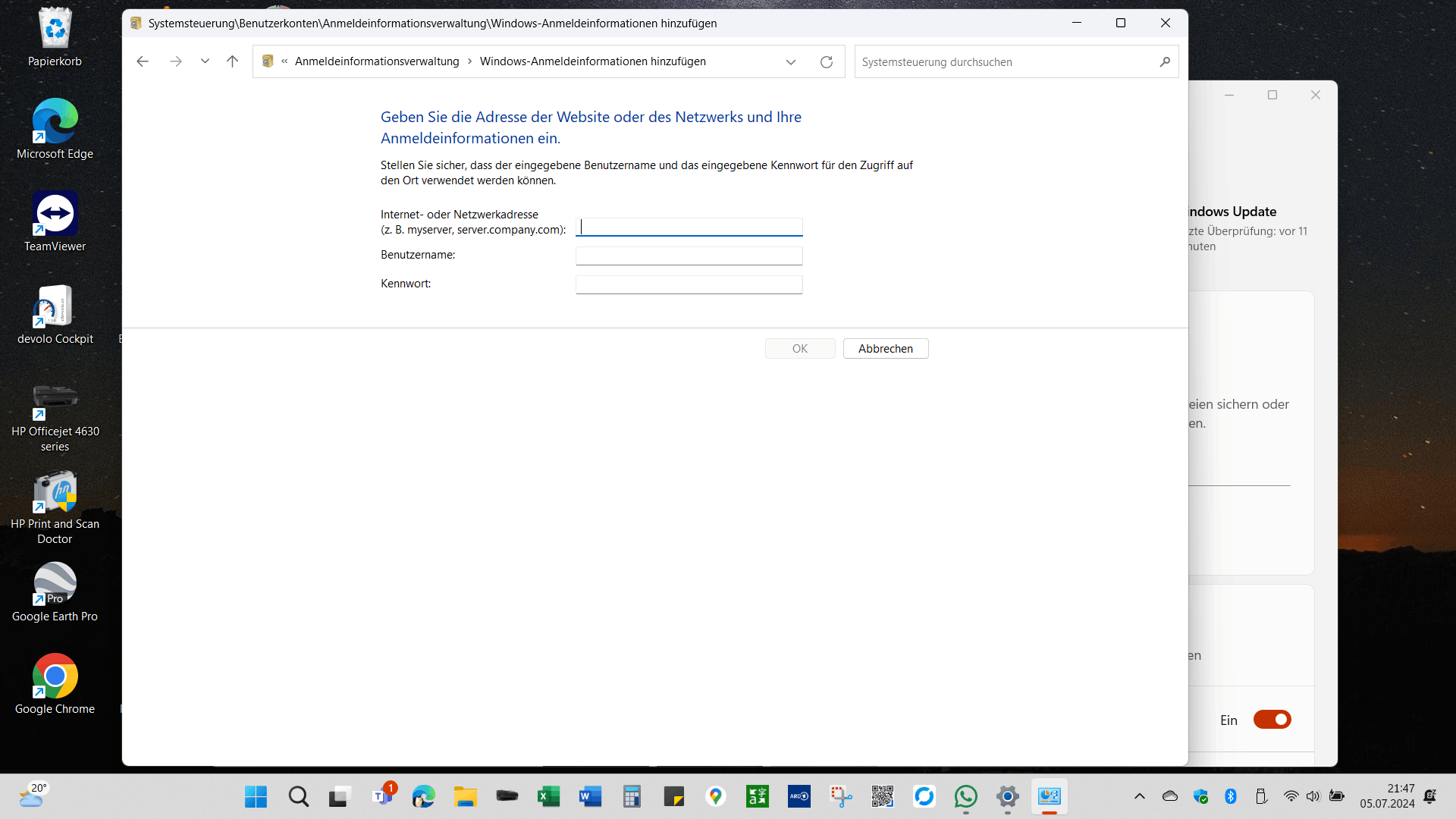 Es sieht so aus, als ob beim Löschen Ihrer Anmeldeinformationen eine Meldung angezeigt wird, in der Sie zur Eingabe einer Internet- oder Netzwerkadresse, eines Benutzernamens und eines Kennworts aufgefordert werden.