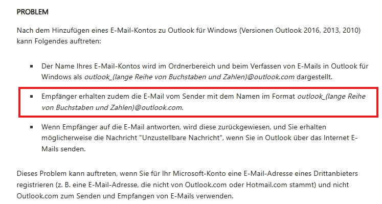Wenn der Empfänger auf diese E-Mail-Adresse antwortet, wird angezeigt, dass die E-Mail unzustellbar ist. Wir empfehlen Ihnen, Ihrem Konto ein Outlook.com- oder Hotmail.com-Domain-Konto hinzuzufügen.