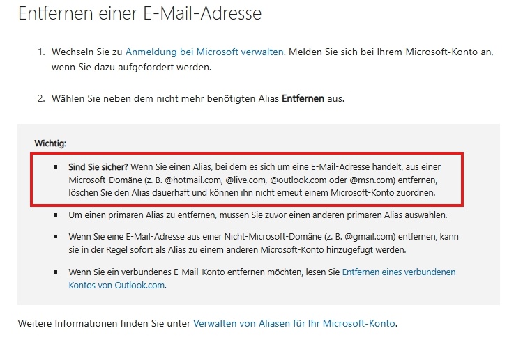 Gemäß den Microsoft-Anforderungen für Aliase wird der Alias beim Löschen eines Aliasnamens eines Hotmail-Domänennamens dauerhaft gelöscht und ist nicht mehr mit einem Microsoft-Konto verknüpft. Wir können die Informationen dieses Alias nicht wiederherstellen.