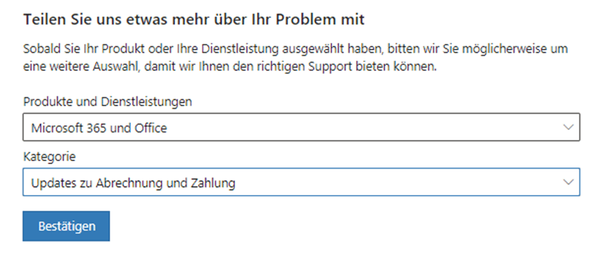 Wählen Sie unter Produkte und Dienste die Option "Microsoft 365 und Office" aus. Wählen Sie unter Kategorie die Option "Abrechnungs- und Zahlungsaktualisierungen" aus. Klicken Sie auf Bestätigen.