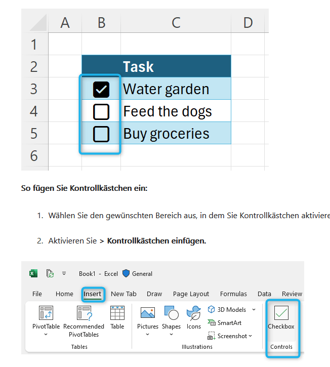 https://support.microsoft.com/de-de/office/using-checkboxes-in-excel-da85546d-c110-49b8-b633-9cebadcaf8d4