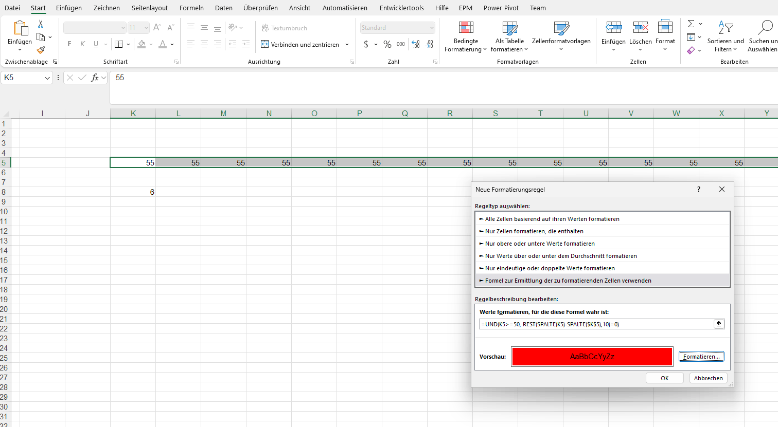 =UND(K5>=50, REST(SPALTE(K5)-SPALTE($K$5),10)=0)