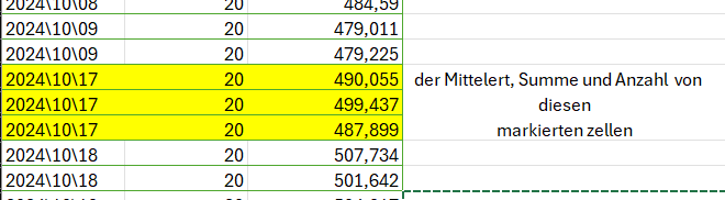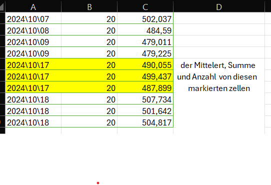 Ist es möglich dann nur die markierten Zellen in Spalte D zählen zu lassen, den Mittelwert der markierten Zellen und die Summe der markierten Zellen?