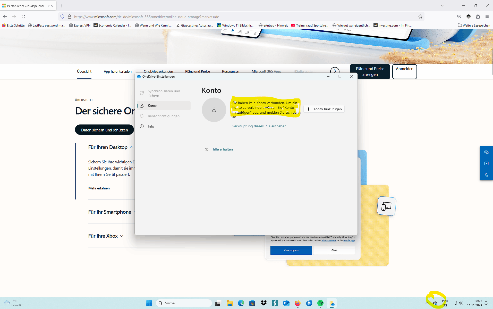 - Öffnen Sie die OneDrive-Einstellungen, und heben Sie die Verknüpfung des Kontos auf.