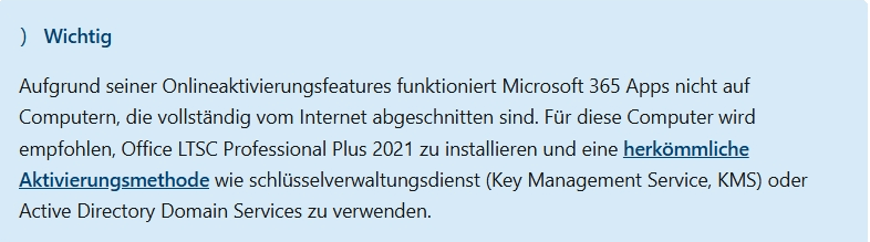 - Microsoft 365 Apps benötigen eine Internetverbindung für die Aktivierung. Während des Installationsvorgangs kommunizieren die Apps mit dem Office-Lizenzierungsdienst, um einen Product Key abzurufen und zu aktivieren. Nach der Aktivierung müssen die Apps mindestens alle 30 Tage eine Verbindung zum Internet herstellen , um den Lizenzstatus zu überprüfen und den Product Key zu erweitern. Weitere Informationen finden Sie in diesem Bild und im Artikel -<Übersicht über die Lizenzierung und Aktivierung in Microsoft 365 Apps - Microsoft 365 Apps | Microsoft Learn>