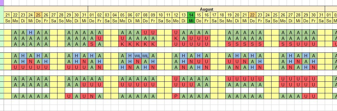 ich habe für die Arbeit einen Kalender in Excel erstellt, in der sich die Kollegen meiner Stelle eintragen können, wann sie anwesend oder im Urlaub sind oder von zu Hause aus arbeiten.