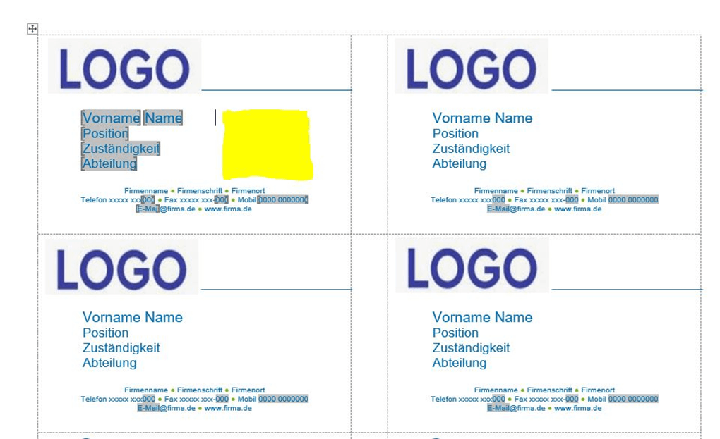 Alles was in der ersten Visitenkarte gegraut ist, wird automatisch nach Eingabe in die übrigen Visitenkarten übernommen. Im gelben Bereich soll der QR Code eingefügt werden und sich genauso automatisch auf die folgenden 9 Visitenkarten übertragen. Dies bekomme ich leider auch nicht dem Rich-Text-Inhaltssteuerelement hin. Aber vielleicht mach ich da was falsch?!