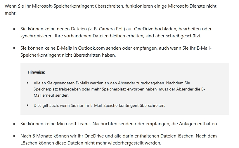 Weitere Informationen finden Sie unter Was geschieht, wenn Sie Ihr Speicherkontingent überschreiten? - Microsoft Support