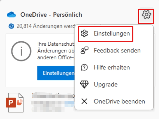 - Wählen Sie in Ihrem Infobereich das OneDrive-Cloudsymbol aus, und wählen Sie dann OneDrive-Einstellungen aus.